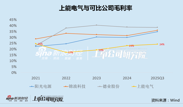 盈利能力不足,更令市场担忧。前三季度,上能电气综合毛利率为24.17%,同比下降1.15个百分点,自2022年以来,长期大幅低于阳光电源等可比公司。