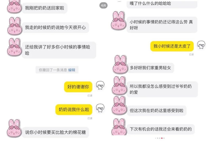 有人找到“外包孙女”后,会嘱咐他们注意事项,比如奶奶牙口不好,吃不了太硬、太辣的东西,奶奶喜欢吃某家小店的海蛎煎,希望可以陪同前往,还告知奶奶腿脚不好,走一段路,就需要休息一会。