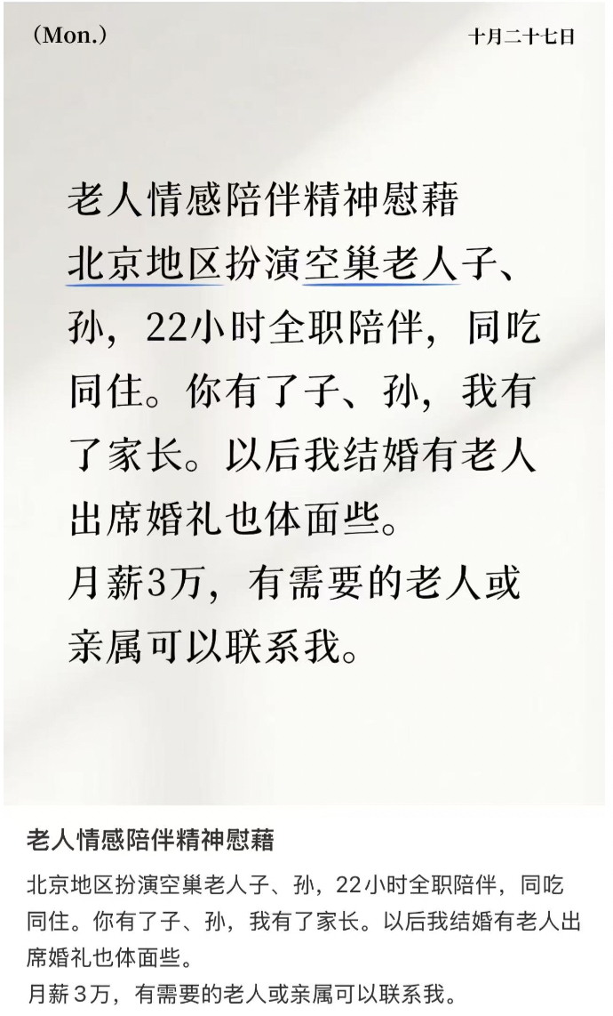 年轻人在社交平台发布“求职帖”,列出自己擅长的服务:做饭、聊天、打扫、陪诊……甚至有人开始组建团队,把这当作一份正经事业来经营。