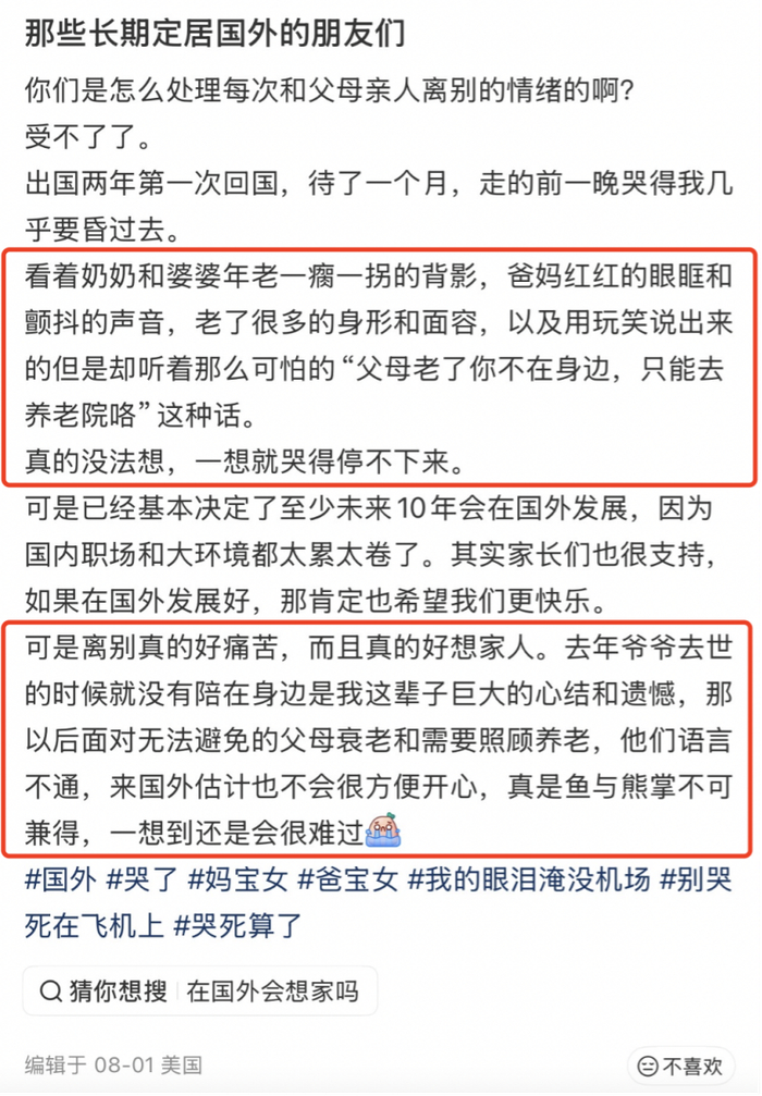 社交平台上,一位出国定居的网友咨询如何处理和父母的关系,评论区里,挤满了同样的叹息。