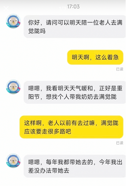 大多数为老人寻找陪伴的,都是远在外地工作的儿女、孙辈,希望能有年轻人带老人出去逛逛,排解孤独。
