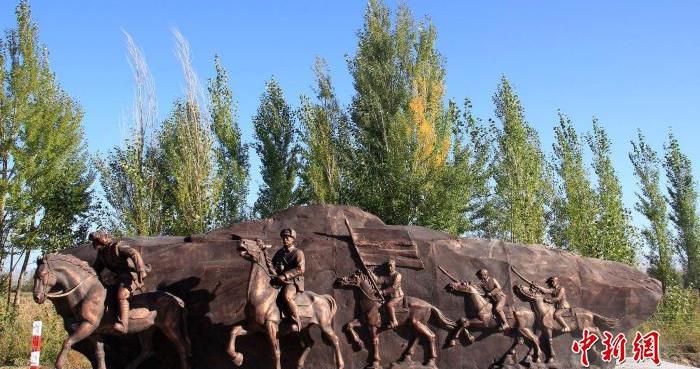 在进入一八一团的道路旁,一组名为“五人策马风驰电掣”的雕像中,解放军官兵高举红旗,冲在最前方的哈萨克族青年的原型,就是胡拥军的父亲胡达拜尔干。