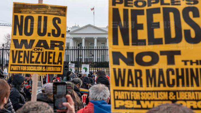 当地时间2026年1月3日,美国华盛顿,一群抗议者在白宫前举着标语,表达对美国在委内瑞拉行动的不满。