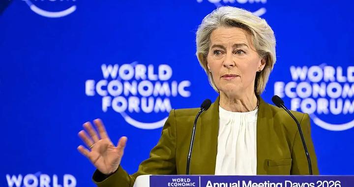 当地时间1月20日,瑞士达沃斯,世界经济论坛(WEF)年会期间,欧盟委员会主席冯德莱恩发表讲话。图源:视觉中国