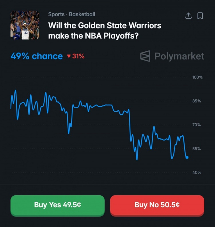 体育预测平台Polymarket Sports更新了勇士晋级季后赛的概率,目前已降至49%。