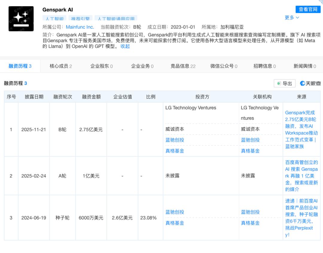 11月20日,位于美国加州帕洛阿尔托的AI搜索引擎Genspark(隶属于公司Mainfunc Inc.,下称:Genspark)完成2.75亿美元B轮融资,投后估值达12.5亿美元。这家公司的创始人&CEO正是原百度集团副总裁、小度科技CEO景鲲,加入百度之前担任微软首席研发总监,负责微软必应搜索亚洲市场的研发工作,也是微软小冰的发明者和创造者;Genspark联合创始人朱凯华曾任谷歌主任架构师、百度集团智能助手首席架构师、小度CTO。景鲲和朱凯华二人,在2013年前后相继加盟百度,携手共事11年,更是自2020年起分别担任估值达55亿美元的小度科技CEO、CTO,直至2023年离职。大厂高管背景,再加上“CEO+CTO”这一顶级配置,叠加大模型热潮,让Genspark在种子轮就融资6000万美元,估值达2.6亿美元。此后,伴随月活用户突破200万、发布全新平台Genspark AI Workspace等发展里程碑,景鲲的新公司在一年半内共完成3轮融资,总融资额约4.35亿美元。这只AI搜索独角兽的诞生,是自然也是必然。两位前百度高管携手创业,剑指“AI搜索”景鲲和朱凯华,均拥有深厚的搜索经验。景鲲曾在微软工作的近10年中,曾负责必应搜索在亚洲市场的研发工作,朱凯华则于2011年在谷歌开创了AI驱动的搜索排序技术。二人于2013年前后相继加盟百度后,和“搜索”相关的工作也并未中断。以景鲲为例,进入百度后,他就职于大搜索任总产品架构师,负责百度大搜索整体产品规划、创新与落地推进。景鲲带领团队大刀阔斧地创新整体搜索体验,为数以亿计的用户提供平等便捷的搜索服务,同时与团队一起开创式地引入了语音搜索、图像搜索、对话式搜索等创新搜索交互方式。2023年以来,随着生成式AI技术在搜索领域的应用,用户搜索内容的结果,从以前的关键词模糊反馈转变为可对话式的精准反馈,极大地提升了用户搜索效率和内容结果的价值。谷歌、百度、360等搜索巨头不约而同将搜索升级为AI搜索,且成效显著。以谷歌为例,就在今年,谷歌搜索的一次重大更新引发行业关注——AI模式(AI Mode)的推出,彻底改变了传统搜索“关键词+点链接”的交互逻辑,将其升级为“持续对话+需求理解”的全新体验。截至2025年10月,该模式已覆盖200+国家/地区、支持35+语言,数据显示用户在AI模式下的提问长度是传统搜索的3倍。Coherent Market Insights报告显示,全球人工智能搜索引擎市场规模预计将于2025年达到436.3亿美元,并在2032年增长至1088.8亿美元,2025-2032年的复合年增长率高达14%。由此可以反推,景鲲和朱凯华在2023年10月前后从百度离职,就并非“突然”,而是深思熟虑的结果。不出意外地,景鲲的创业公司,甫一露面就剑指“AI搜索”,而这也被外界形容为——想要再造一个“百度”。经过短短半年筹备,景鲲和朱凯华就在2024年6月,上线了Genspark的Beta版,初期定位为AI Agent引擎。作为一种新网页形式,Genspark改变了用户与在线信息交互的方式,背后使用了各种大模型来处理任务,包括Meta的LLaMA等开源模型、OpenAI的GPT系列模型。伴随产品上线,Genspark完成6000万美元种子轮融资,由新加坡基金Lanchi Ventures(蓝驰创投)领投,并得到了其他全球天使投资者的支持,公司估值为2.6亿美元。最新消息显示,景鲲和朱凯华找来的创业搭档——联合创始人兼COO桑文,拥有MIT博士学位,此前创立并由Y Combinator和Khosla Ventures支持的企业SaaS公司Smarking并成功退出。Genspark在官方介绍里称,正是这种构建大型AI系统的基因,使Genspark能够建立起业界领先的质量评估体系,确保其智能代理所交付的成果具备高完成度——用户通常只需一次指令,就能获得高质量的交付成果。一年半3轮融资超4亿美元,上线5月年化收入破5000万美元近两年,AI的竞争焦点已超越模型能力或更智能的聊天机器人,关键是交付对用户真正有意义的、立竿见影的工作成果。景鲲和朱凯华,适时转向通用智能体方向。就在今年3月悄然完成1亿美元A轮融资,估值提升至38.52亿元的次月,Genspark正式发布了Genspark Super Agent,集成深度研究、多模态生成等功能,在GAIA基准测试三个不同级别中均超越Manus、OpenAI等竞品。据介绍,Genspark Super Agent采用多智能体混合(Mixture-of-Agents)系统架构,集成8个差异化大语言模型及80余种工具集,支持自主调用Python解释器、幻灯片制作器、视频生成器等工具处理复杂任务。上线9天,Genspark Super Agent便实现1000万美元年化营收,45天达3600万美元ARR。今年7月,该产品更是入选全球百大AI应用榜单。产品上线仅五个月内,年化收入便突破5000万美元,成为AI行业内增长最快的企业之一。这些成绩,自然值得投资机构重金下注。于是在11月20日的B轮融资中,Genspark获得由硅谷顶尖风投Emergence Capital Partners领投,其他全球领先科技投资方包括SBI Investment、LG Technology Ventures、Pavilion Capital、Uphonest Capital,首轮最大投资方蓝驰创投等所有现有投资方亦在本轮持续加码。