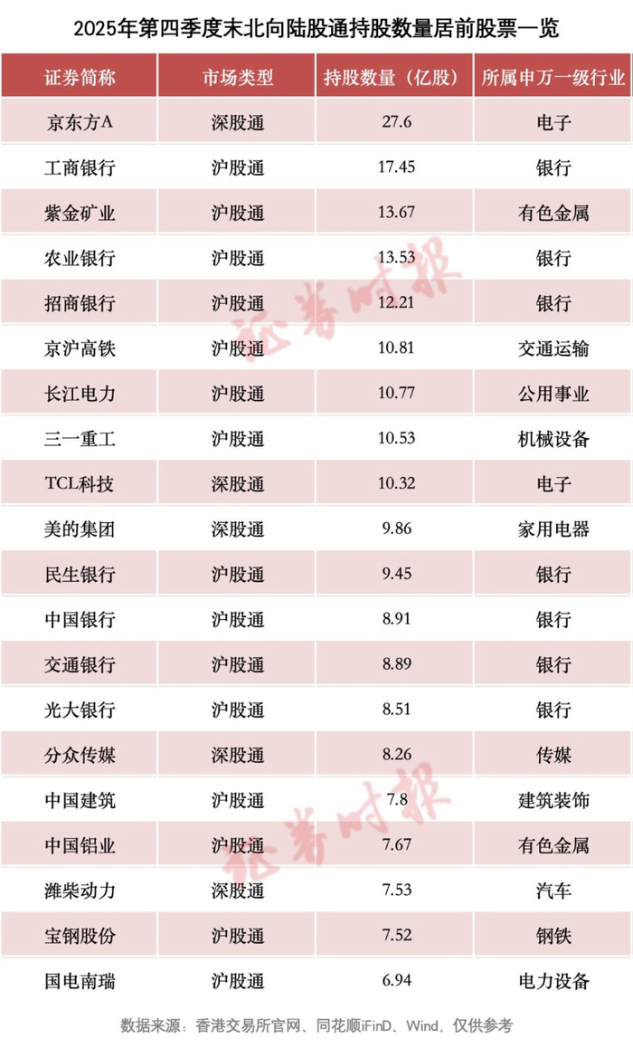 北向陆股通资金2025年第四季度持股情况已经出炉。