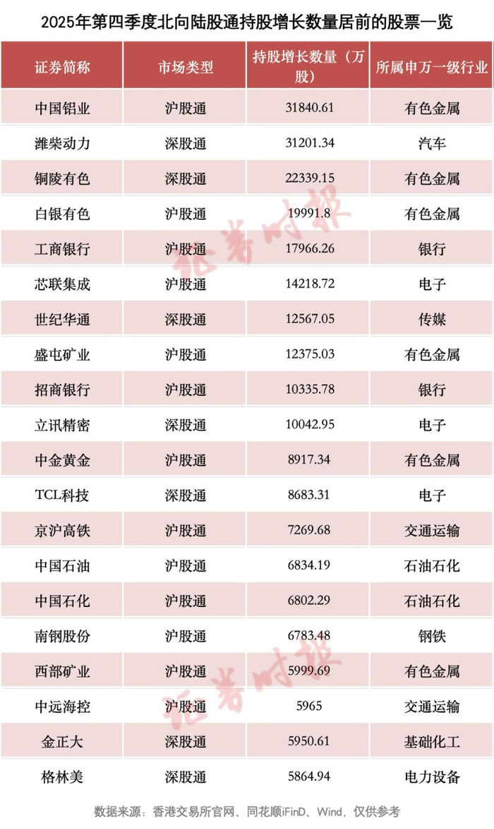 根据香港交易所网站披露的资料,北向陆股通2025年第四季度末的持股数据正式公布,北向陆股通资金在该季度的持股动向初步浮出水面。