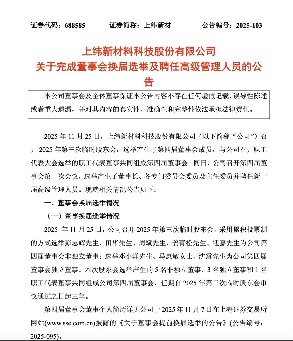 11月25日,上纬新材料科技股份有限公司(688585.SH)(以下简称“上纬新材”)召开了2025年第三次临时股东会。根据公司公告披露,本次临时股东会通过累积投票制的方式选举了彭志辉、田华、周斌、姜青松、钮嘉为公司第四届董事会非独立董事。