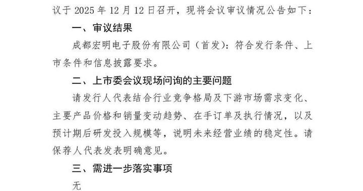 12月12日,深交所官网显示,成都宏明电子股份有限公司(以下简称“宏明电子”)创业板IPO项目获得上市委审议通过,即将进入发行与上市阶段。作为国内电子元件行业的领军者,宏明电子连续承担国家“十三五”和“十四五”重点研发计划,并获得多项国家科技进步奖。