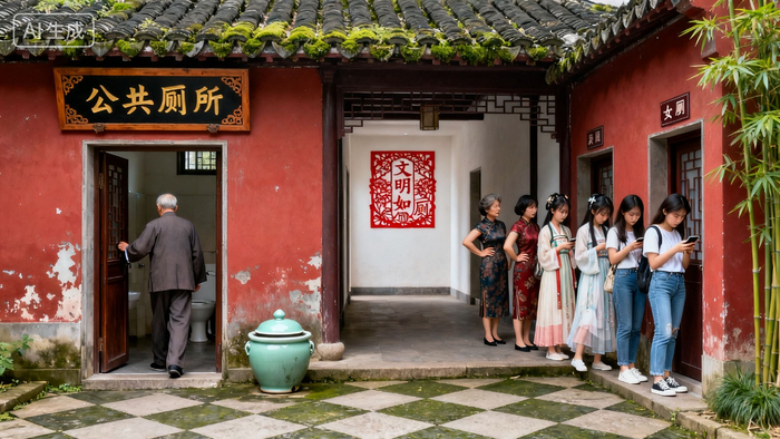 现在很多公共厕所都是中式设计,红墙黛瓦的外观,雕花的木门,洗手台是青花瓷的,墙上挂着 “文明如厕” 的剪纸,看着很雅致,但不管设计多好看,女生上厕所的流程还是一样复杂,排队还是一样久!