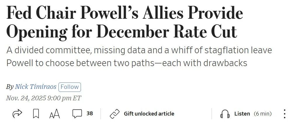 新美联储通讯社 Nick Timiraos 再度发文,题目非常直白《美联储主席鲍威尔的盟友为12月降息铺路》。