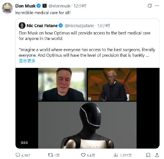 针对该帖子,马斯克回应称:“为所有人提供不可思议的医疗服务!”