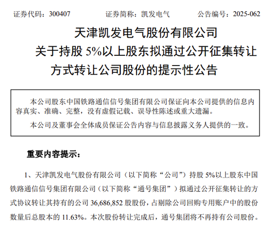 凯发电气11月25日晚间公告称,持股5%以上股东中国铁路通信信号集团有限公司(简称“通号集团”)拟通过公开征集转让的方式协议转让其持有的公司3668.69万股股份,占剔除公司回购专用账户中的股份数量后总股本的11.63%。
