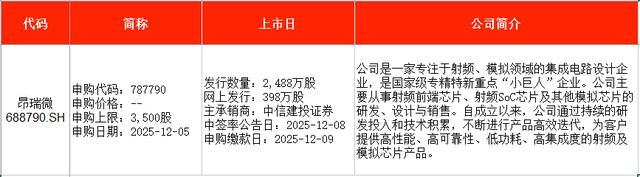 从时间表看,昂瑞微(688790)将在本周五(12月5日)申购;沐曦股份(688802)也将在本周五(12月5日)申购。