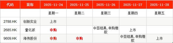 港股方面,Wind数据显示,本周(11月24日至11月28日)量化派(02685.HK)将在周一申购;海伟股份(09609.HK)将在周一至周二申购。