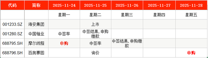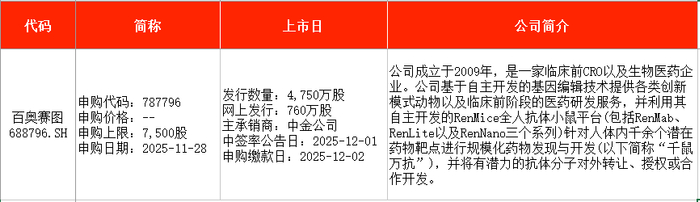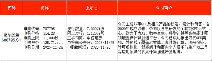 从时间表看,摩尔线程(688795)将在本周一(11月24日)申购;百奥赛图(688796)将在本周五(11月28日)申购。